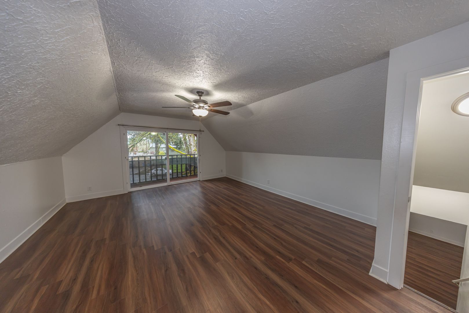 The large living room provides plenty of space to relax or entertain, highlighted by warm flooring and a cozy fireplace that adds character to the home. Natural light fills the space through oversized windows, creating an open and welcoming feel.