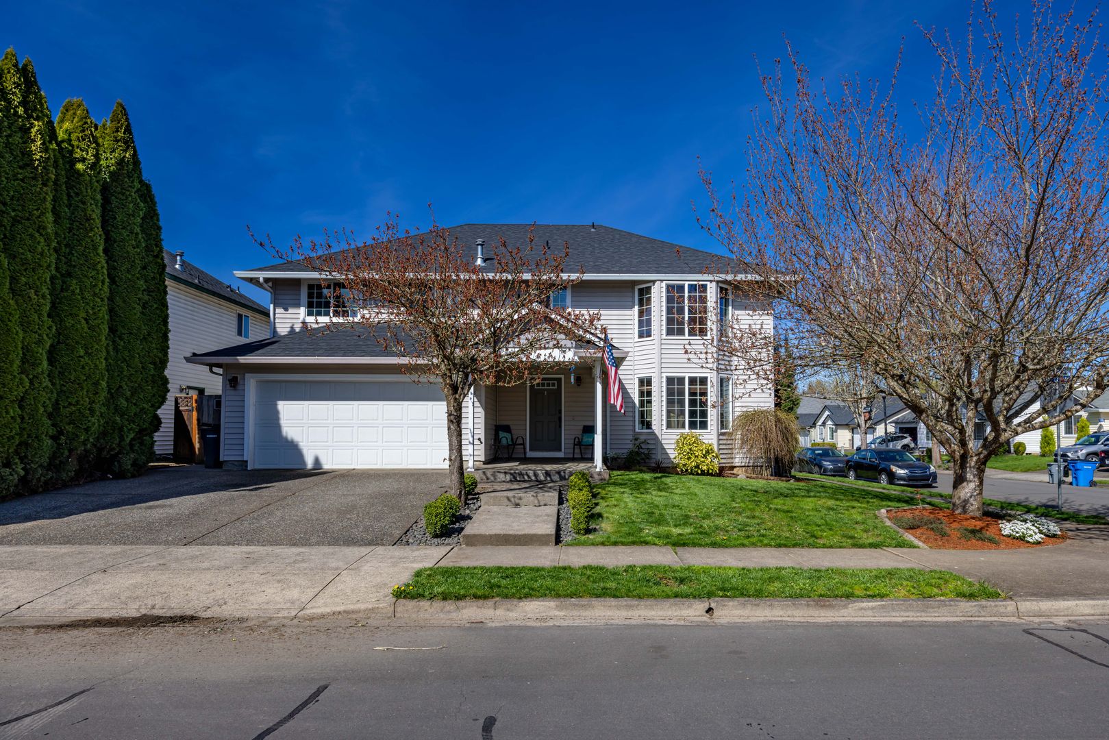 Spacious 5-bedroom, 2.5-bath home in Battle Ground, WA featuring a mix of laminate flooring and upstairs carpet. The kitchen includes stainless steel appliances and the home is equipped with air conditioning, a gas furnace and gas water heater for year-round comfort. Step outside to a fenced backyard ideal for outdoor use and privacy. Fenced garden area and large covered patio.